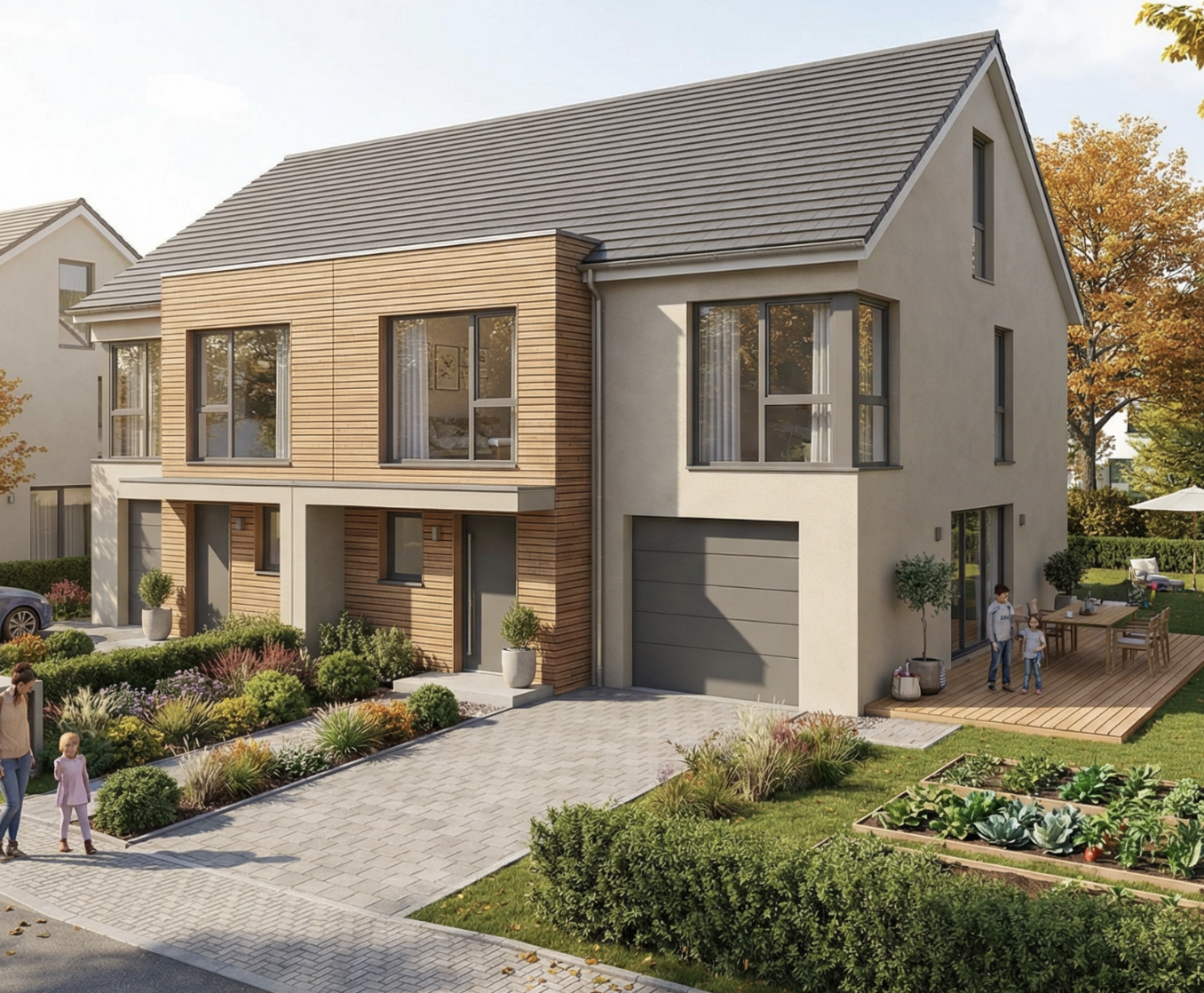 Maison semi-mitoyenne moderne proposant une façade soignée, un garage intégré et un aménagement extérieur pratique. Parfaite pour une vie familiale sereine dans un quartier calme et résidentiel.